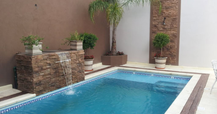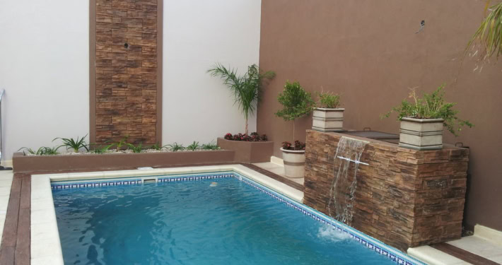 Sobre paredes laterales que enmarcan la piscina se realizan columnas revestidas con la misma piedra que se utiliza para revestir la piscina, quedando así todo el espacio armoniosamente integrado.