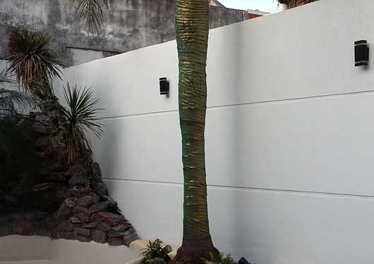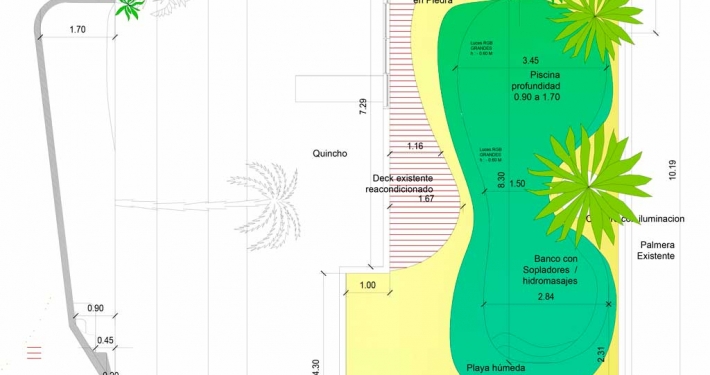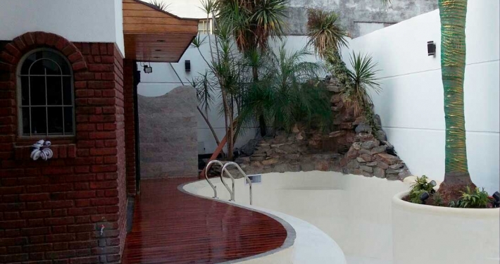 Este Proyecto se basó en incorporar la palmera existente salvando a reutilizar una cascada en piedras naturales de una fuente existente y vincularla con la piscina era una condición inamovible que caracteriza esta piscina